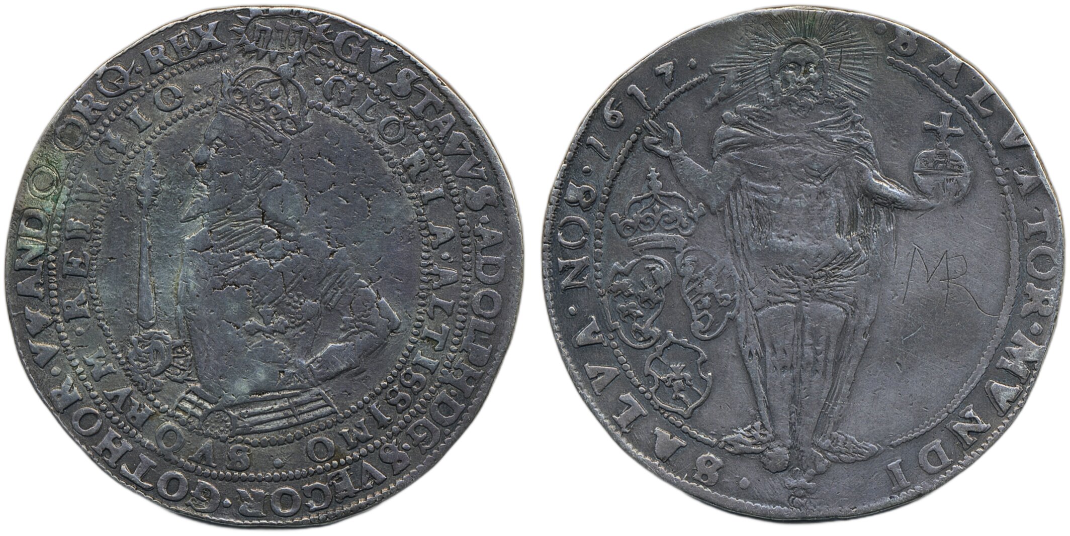 Coins, Sweden. Gustav II Adolf, SM 30, 1 riksdaler 1617. 31.14 g. Stockholm. Has been mounted, graffiti, plachet flaws. 1+.