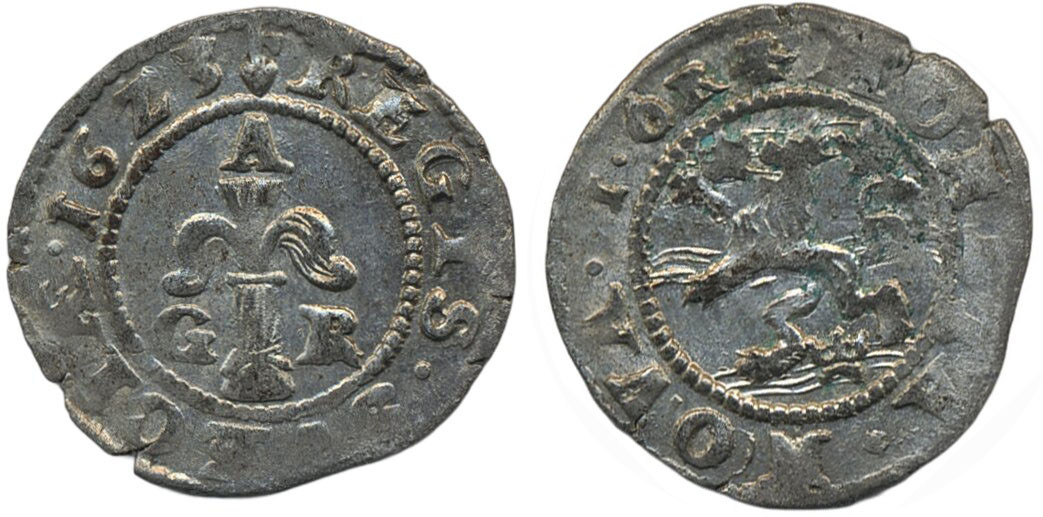 Coins, Sweden. Gustav II Adolf, SM 118, 1 öre 1623. 1.77 g. Kalmar. Lustrous and beautiful example. RR. 1+/01.