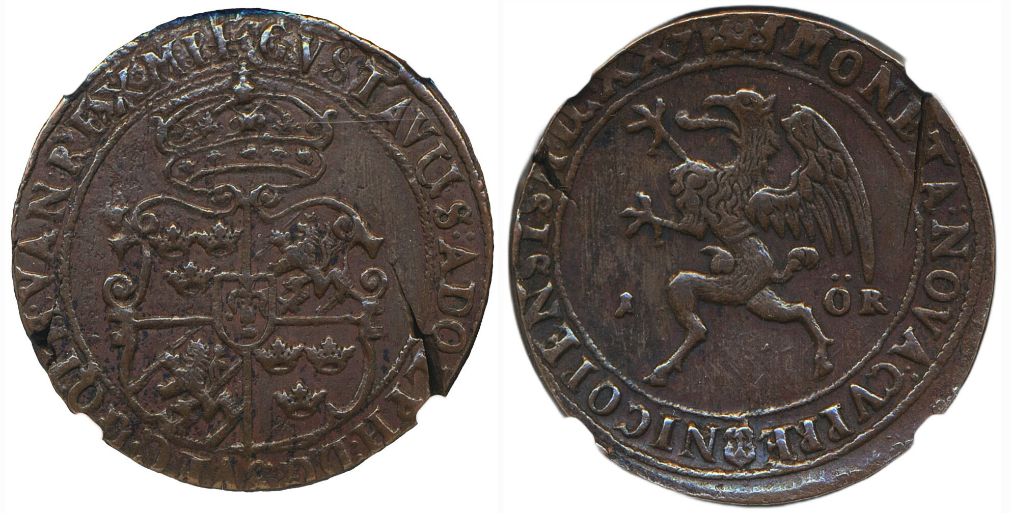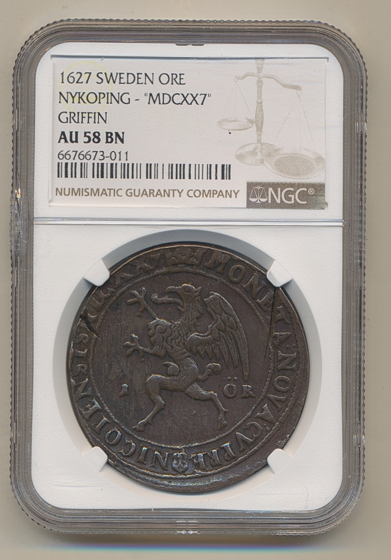 Coins, Sweden. Gustav II Adolf, SM 181c, 1 öre 1627. Nyköping. MDCXX7 in date. Graded by NGC as AU58. Planchet cracks from production. Nice example without corrosion. 1+/01. See certification at NGC