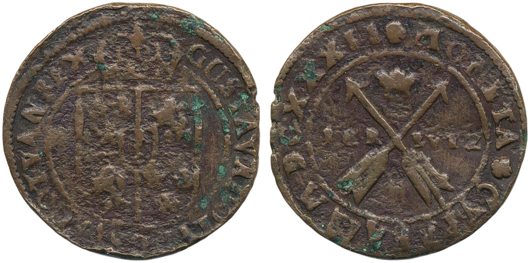 Coins, Sweden. Gustav II Adolf, SM 202a, 1 kreuzer 1632. 18.10 g. Säter and Nyköping. Mintmark arrow in shield. Edge flaws, planchet flaws, corroded, verdigris. 1?)(1?/1.