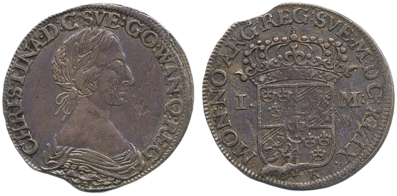 Coins, Sweden. Kristina, SM 79, 1 mark ND(1649). 5.03 g. Stockholm. 1+.