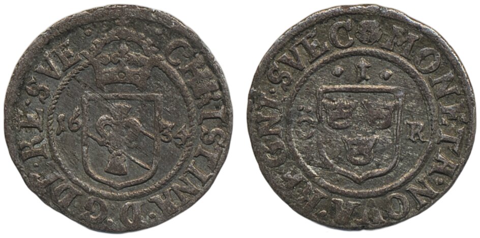 Coins, Sweden. Kristina, SM 85, 1 öre 1634. 1.14 g. Stockholm. D.G.DE.RE.SVE and REGNI SVEC in legend. 1+.