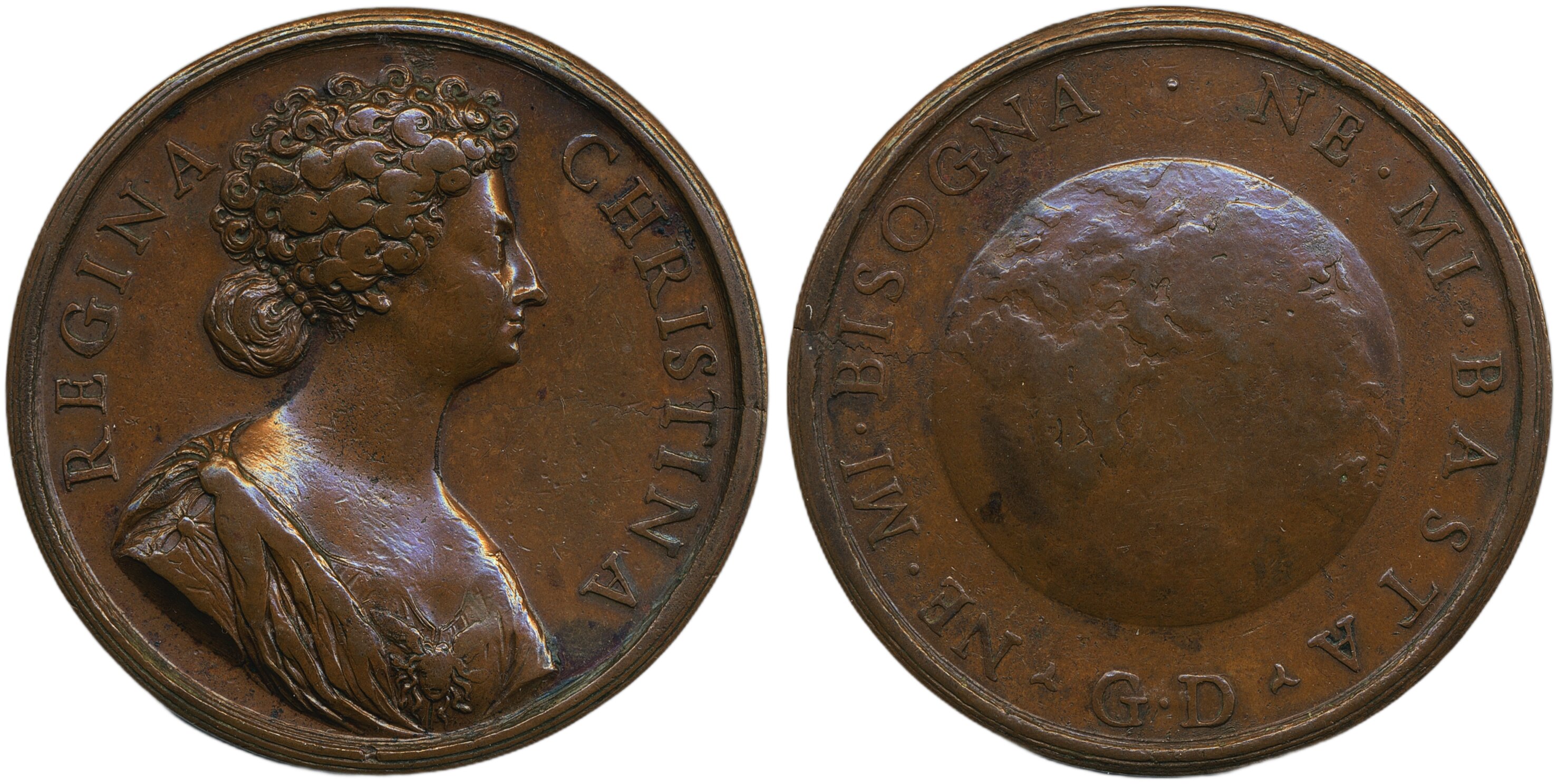 Medals, regal, Sweden. Kristina, Hild. 88b, Queen Kristina in Rome circa 1685, by Giovanni Battista Guglielmada – Hybrid minting. RR. 62 mm. 77.6 g. Ex. Thomas Lantz. 1+.