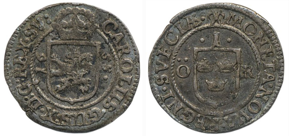 Coins, Sweden. Karl X Gustav, SM 29, 1 öre 1655. 0.92 g. Stockholm. 1+/01.