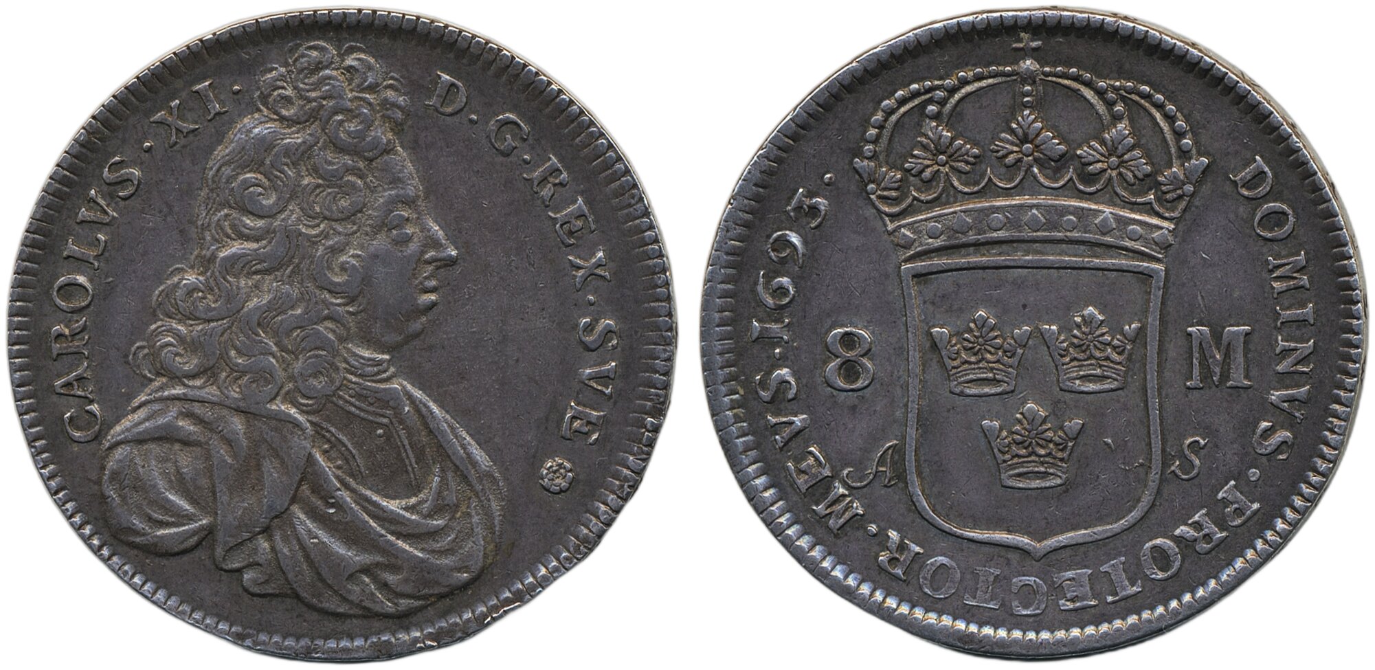 Coins, Sweden. Karl XI, SM 65, 8 mark 1693. 31.21 g. Stockholm. Beautiful example with dark gray toning and hints of lustre. 1+/01.