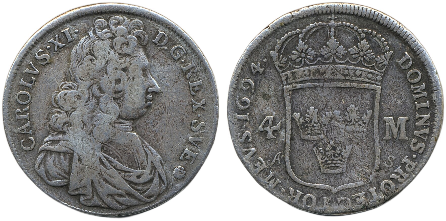 Coins, Sweden. Karl XI, SM 88, 4 mark 1694. 19.06 g. Stockholm. Corroded, scratches. 1.