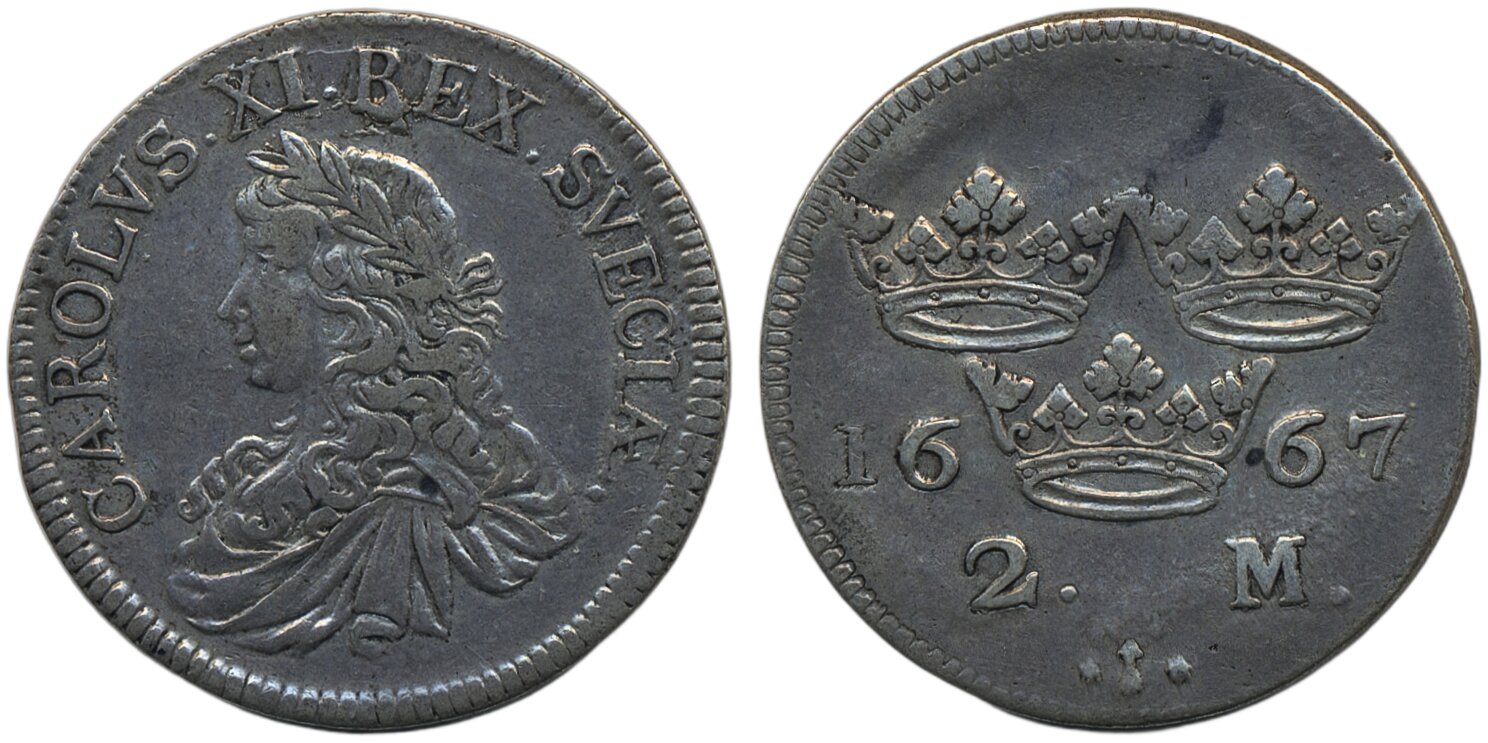 Coins, Sweden. Karl XI, SM 119, 2 mark 1667. 10.68 g. Stockholm. 1+.