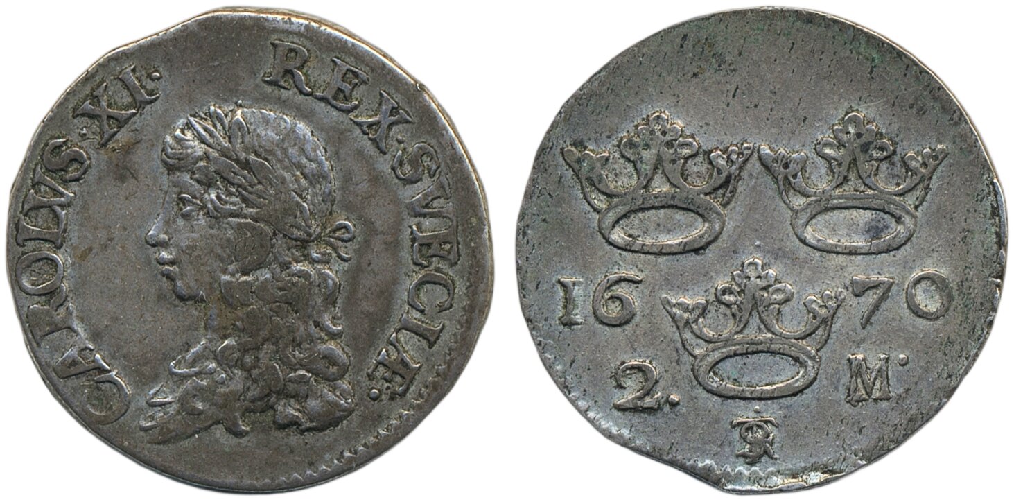 Coins, Sweden. Karl XI, SM 125 b, 2 mark 1670. 10.49 g. Stockholm. 1/1+.