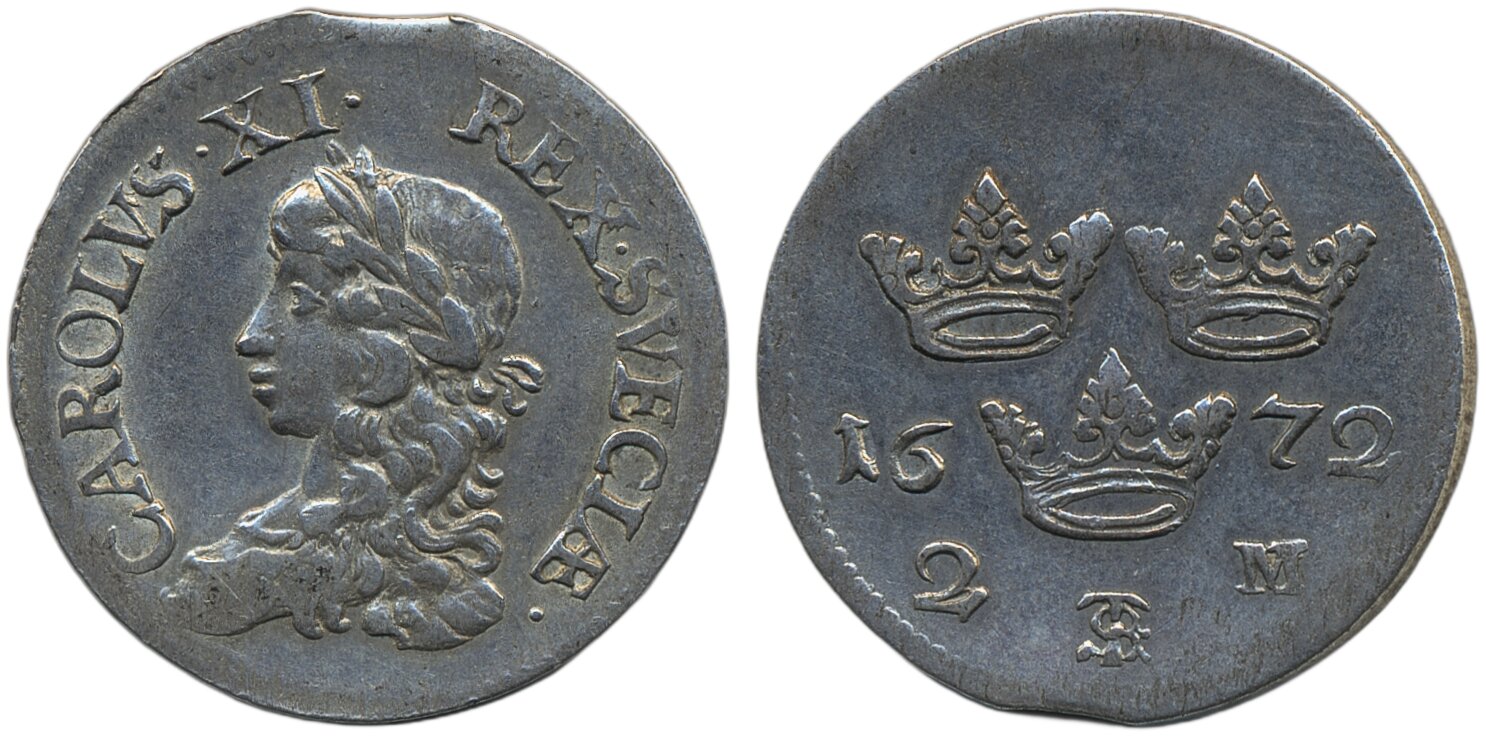 Coins, Sweden. Karl XI, SM 128a, 2 mark 1672. 9.98 g. Stockholm. Moneyer First. 1+/01.