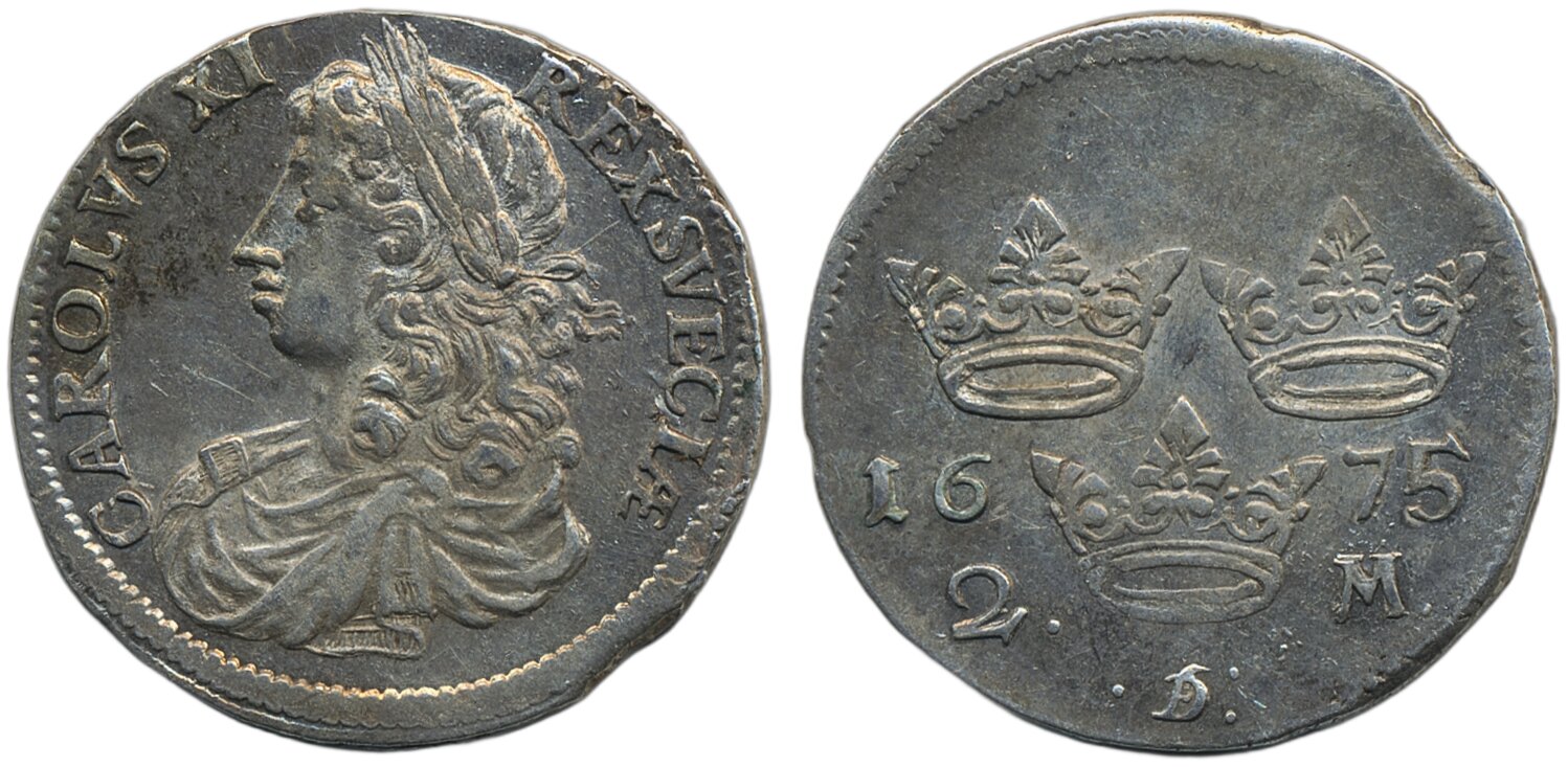 Coins, Sweden. Karl XI, SM 133b, 2 mark 1675. 10.33 g. Stockholm. Minor cleaning but lustrous and attractive example. Göhle 821. 1+/01.