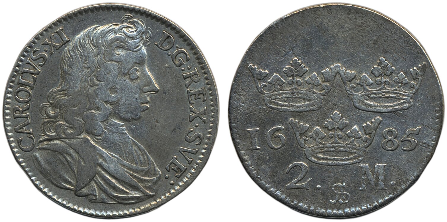 Coins, Sweden. Karl XI, SM 146, 2 mark 1685. 10.66 g. Stockholm. 1+.