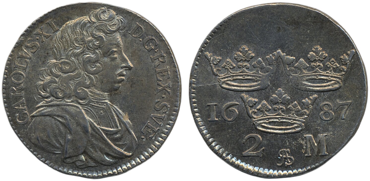 Coins, Sweden. Karl XI, SM 148, 2 mark 1687. 10.29 g. Stockholm. Lightly cleaned reverse. Göhle 910. 01.