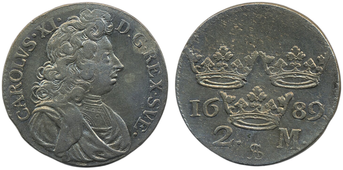 Coins, Sweden. Karl XI, SM 150, 2 mark 1689. 10.17 g. Stockholm. Lustrous example with somewhat matte patina. 1+/01.