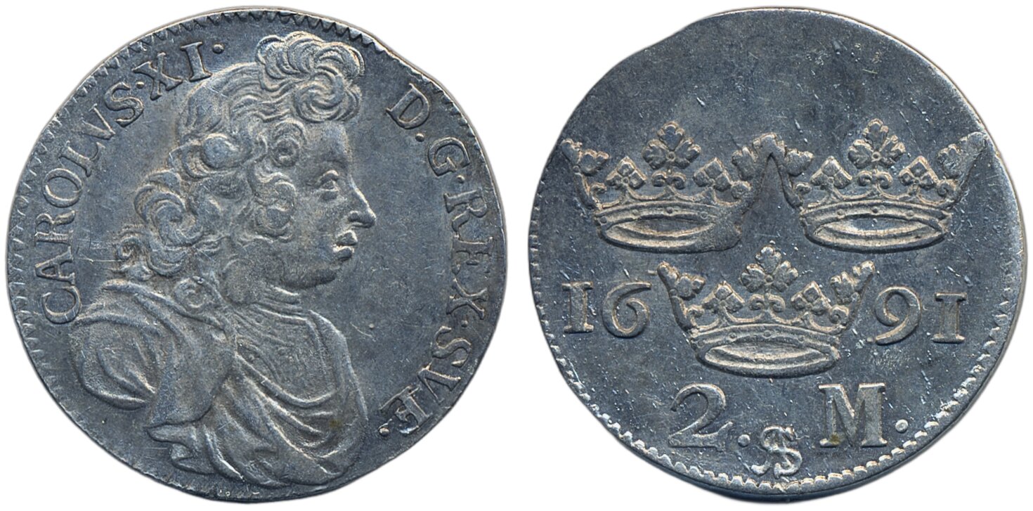 Coins, Sweden. Karl XI, SM 152, 2 mark 1691. 10.33 g. Stockholm. 1+/01.