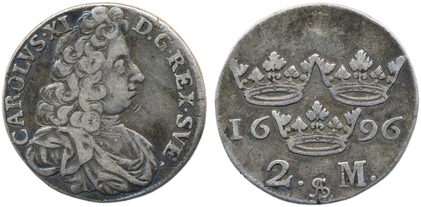 Coins, Sweden. Karl XI, SM 157, 2 mark 1696. 9.92 g. Stockholm. Minor scratch on reverse. 1/1+.