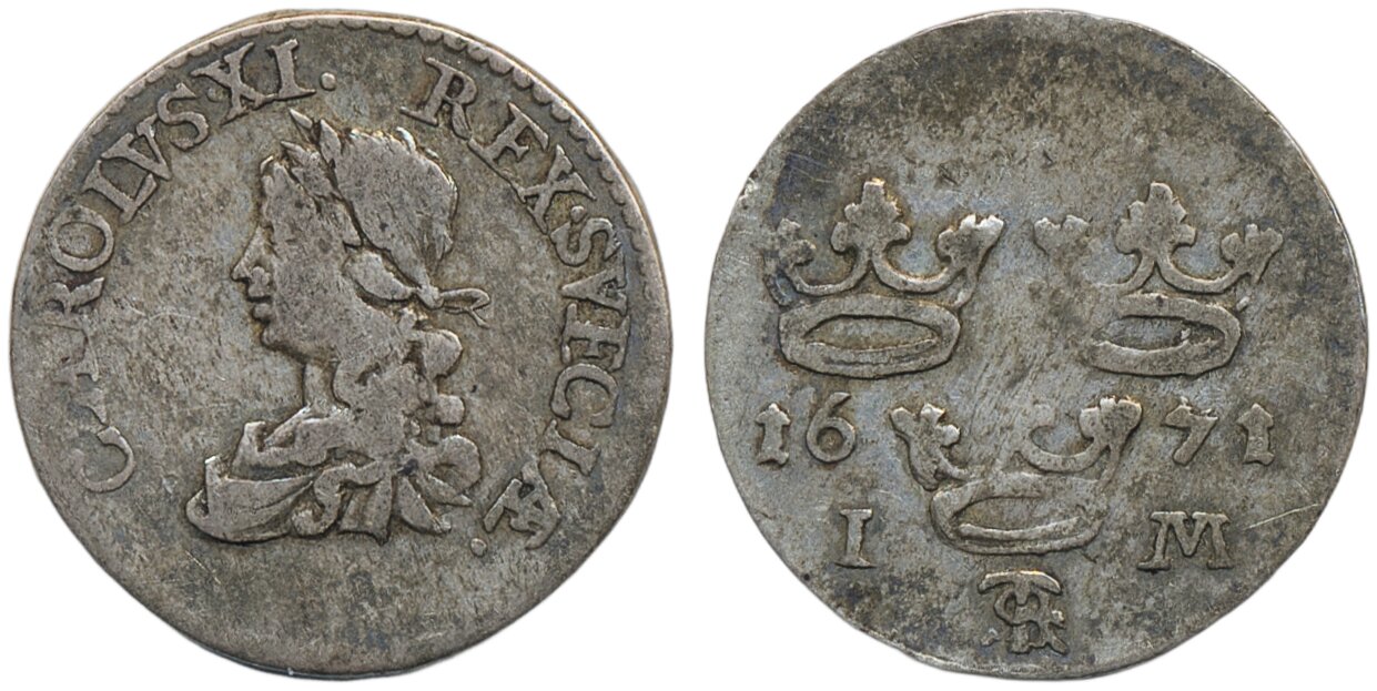 Coins, Sweden. Karl XI, SM 169e, 1 mark 1671. 4.92 g. Stockholm. RR. 1.