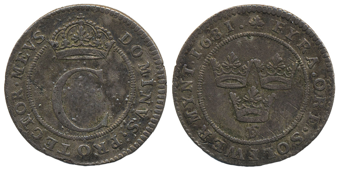 Coins, Sweden. Karl XI, SM 210, 4 öre 1681. 3.05 g. Stockholm. Scarce date. Lightly corroded. 1+.