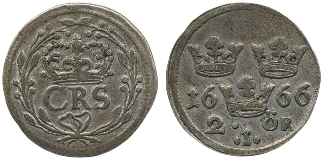 Coins, Sweden. Karl XI, SM 216d, 2 öre 1666. 1.92 g. Stockholm. Attractive example with original toning. 1+/01.