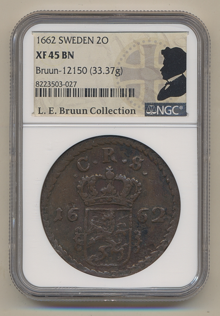 Coins, Sweden. Karl XI, SM 338, 2 öre KM 1662. 33.37 g. Avesta. Struck with somewhat corroded dies. Ex. Bruun. Graded by NGC as XF45. 1+. See certification at NGC