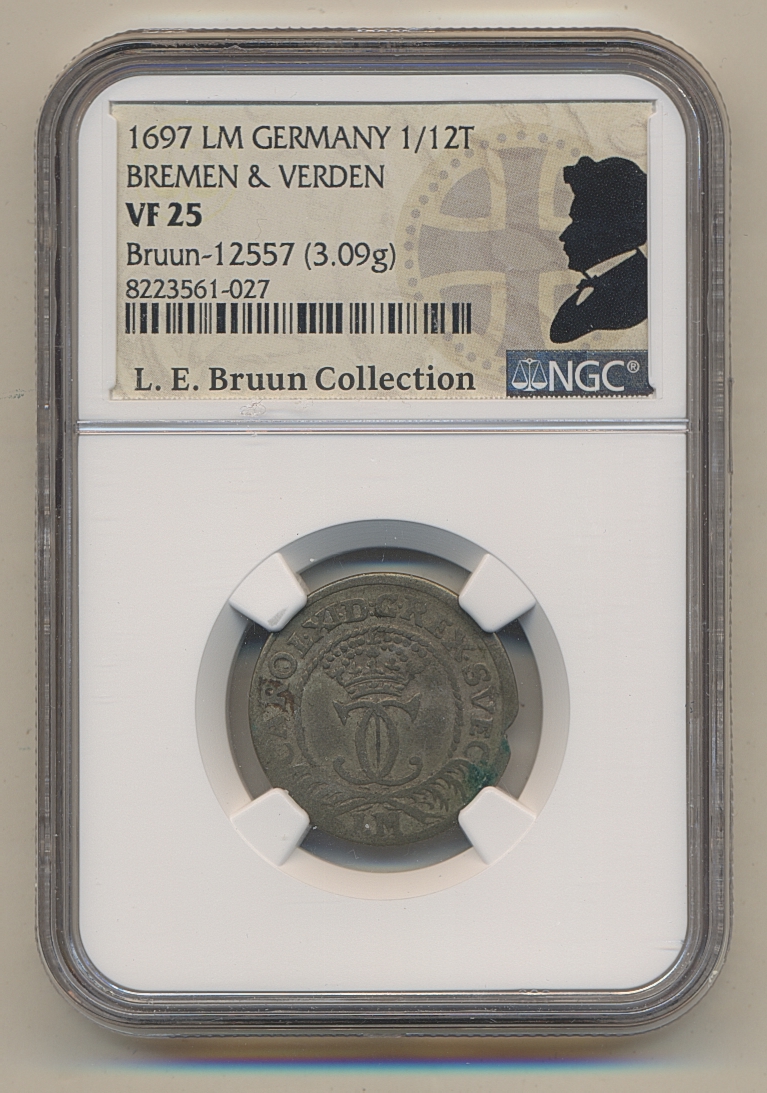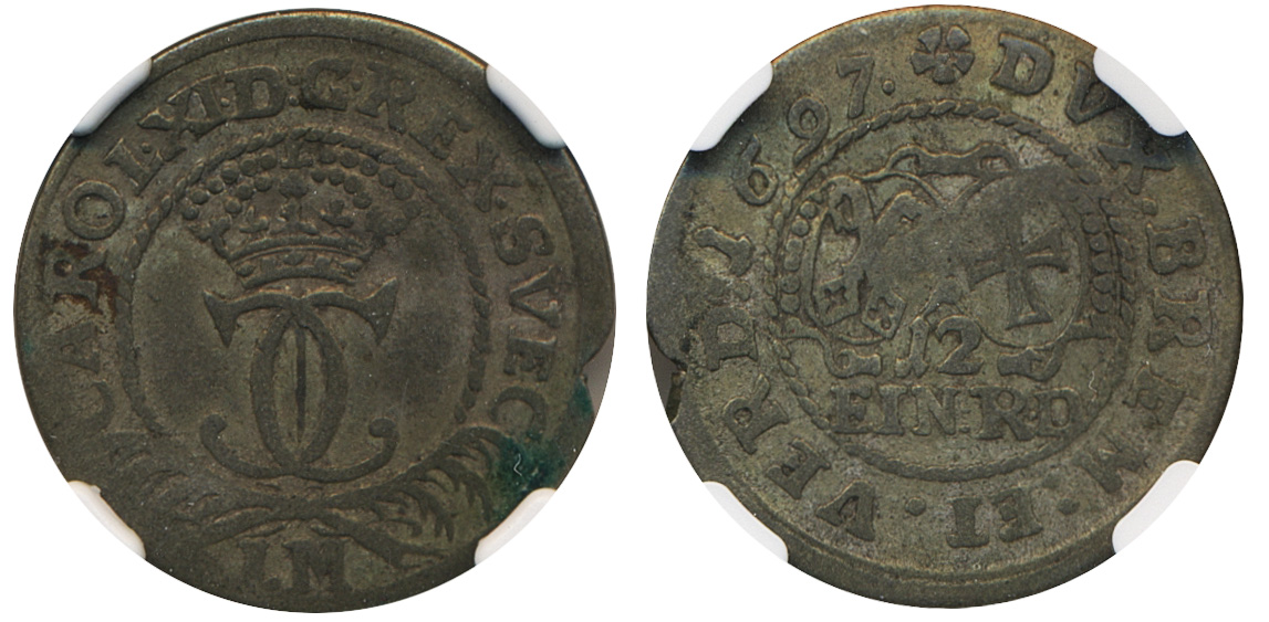 Coins, Sweden, Bremen-Verden. Karl XI, SB 32, 1/12 taler 1697. 3.09 g. Stade. Minor planchet flaw at edge, some verdigris. Ex. Bruun. Graded by NGC as VF25. SMB 651. 1. See certification at NGC