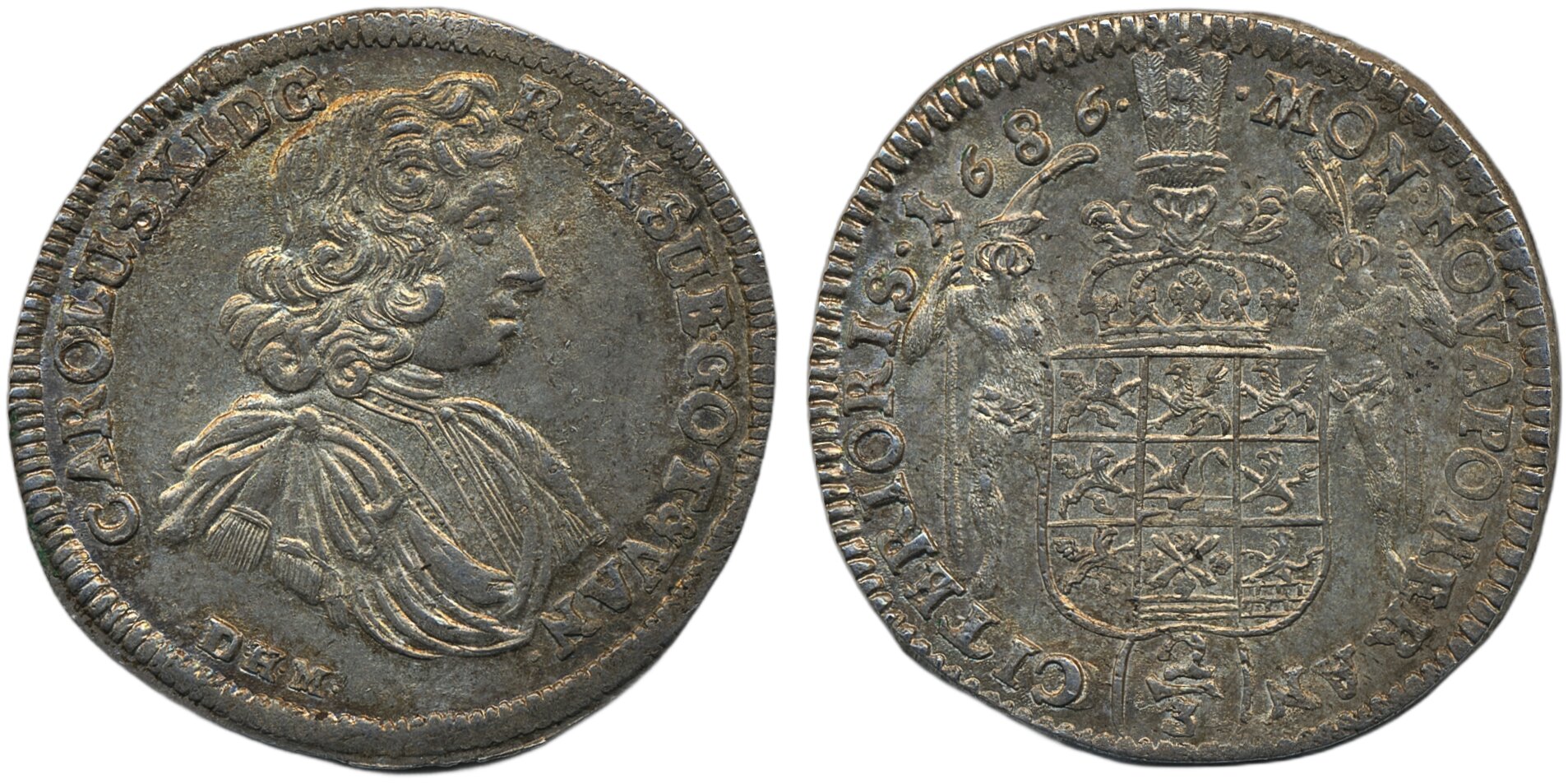 Coins, Swedish possessions, Pomerania. Karl XI, SB 107, 2/3 taler 1686. 19.76 g. Stettin. Superb example with full lustre. SMB 797. 01/0.