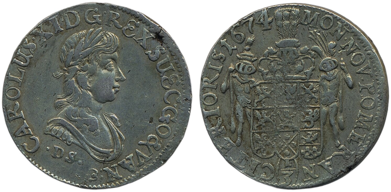 Coins, Swedish possessions, Pomerania. Karl XI, SB 127, 1/3 taler 1674. 9.67 g. Stettin. Minor obverse planchet flaw. Attractive example. SMB 814. 1+/01.
