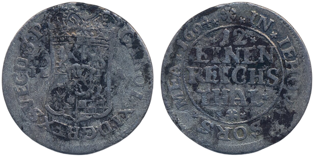 Coins, Swedish possessions, Pomerania. Karl XI, SB 154, 1/12 taler 1694. 2.78 g. Stettin. Somewhat spotty patina. SMB 854. 1.