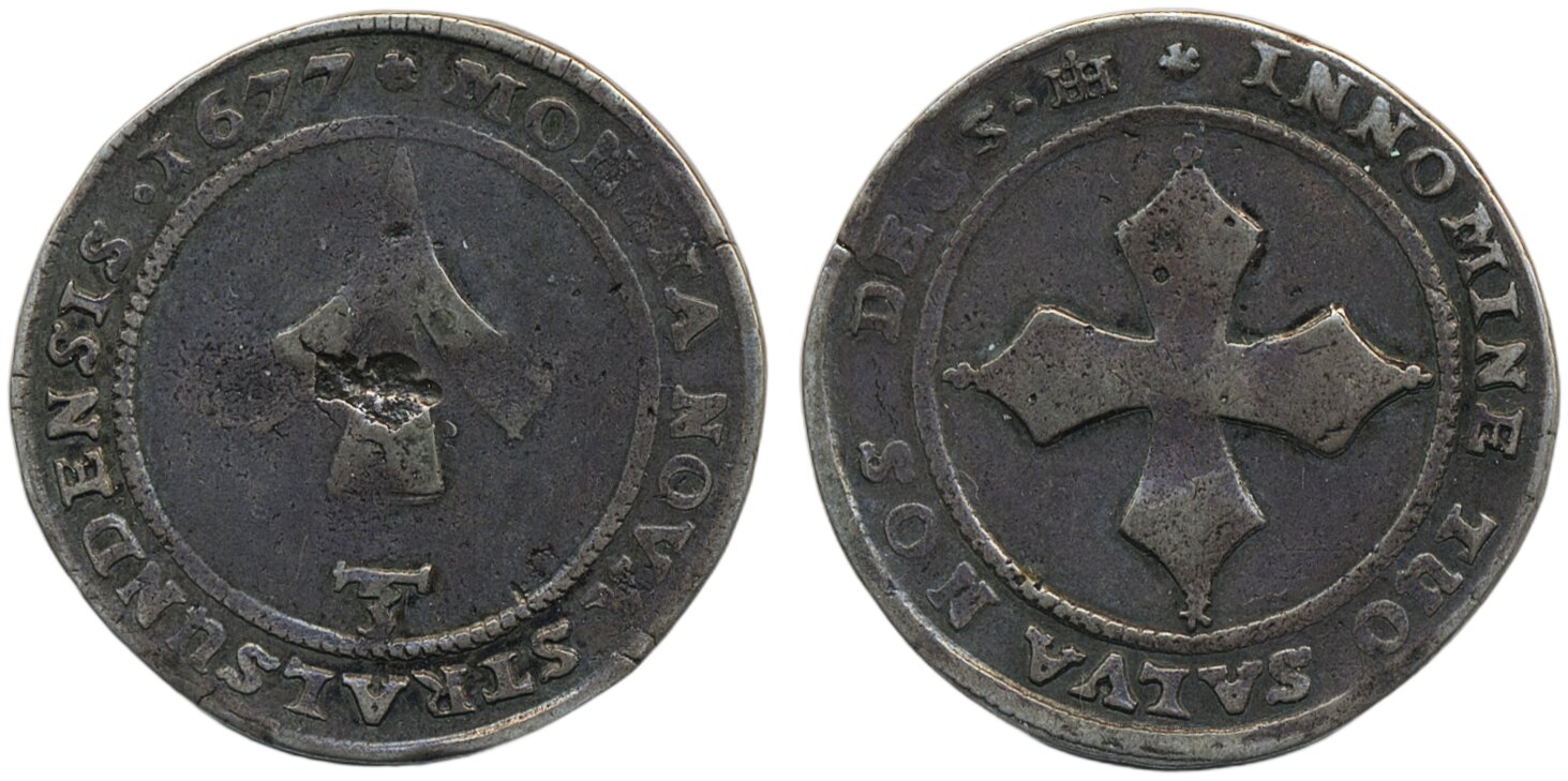 Coins, Swedish occupation, Stralsund. Karl XI, SB 64, 1/3 taler 1677. 9.58 g. Planchet flaw on obverse. SMB 1077. 1/1+.