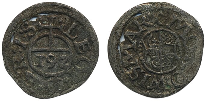 Coins, Swedish occupation, Wismar. Karl XI, SB 60, 1/192 taler (witten) ND (1660-71). 0.35 g. Minor planchet issues where you can partly see through the coin. SMB 1171. 1/1+.
