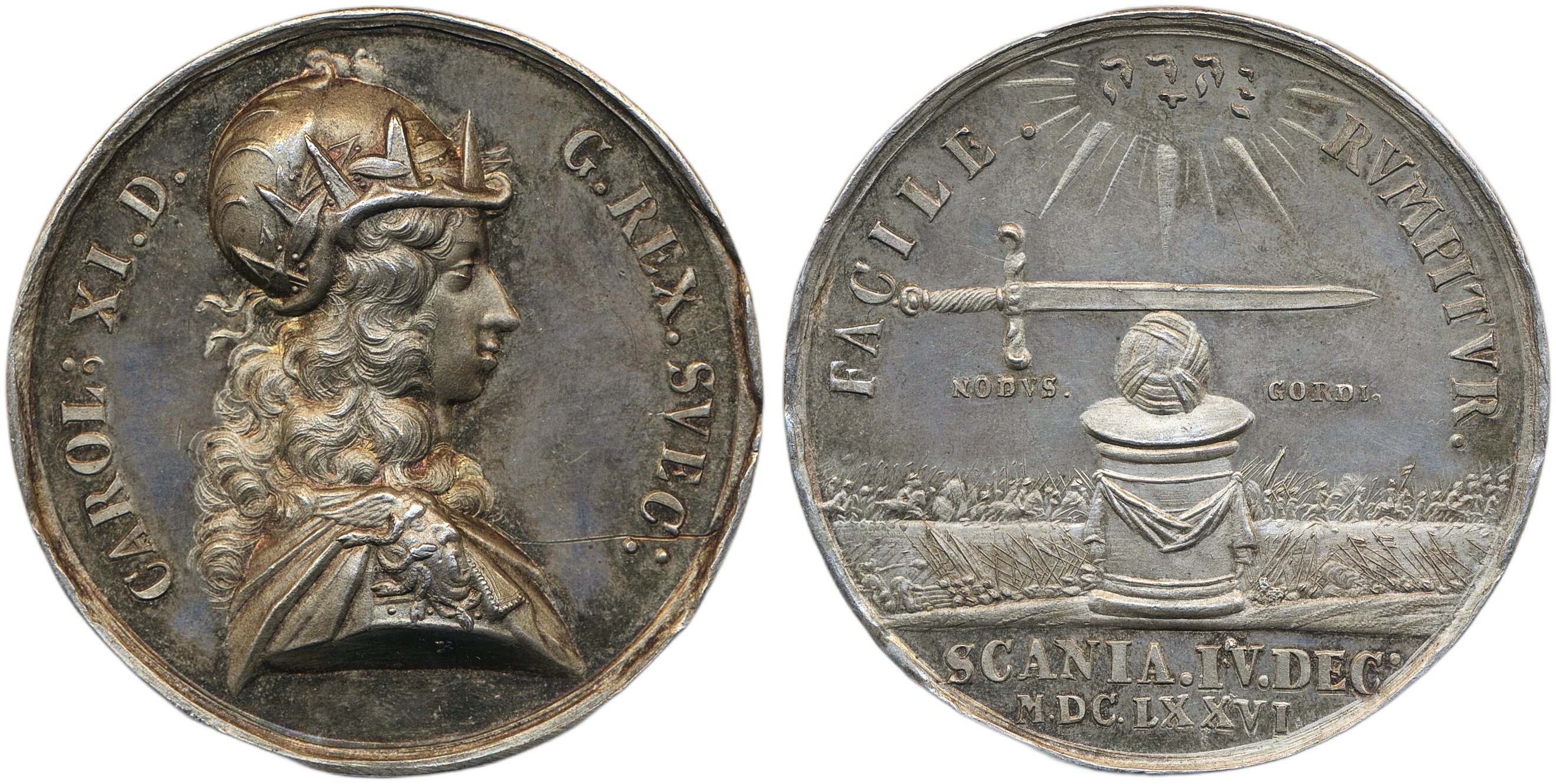 Medals, regal, Sweden. Karl XI, Hild. 52, The victory over the Danish army in the Battle of Lund December 4, 1676. Cabinet copy with insignificant obverse scratch in right field. 56.2 g. 55 mm. The best known example. 01/0.