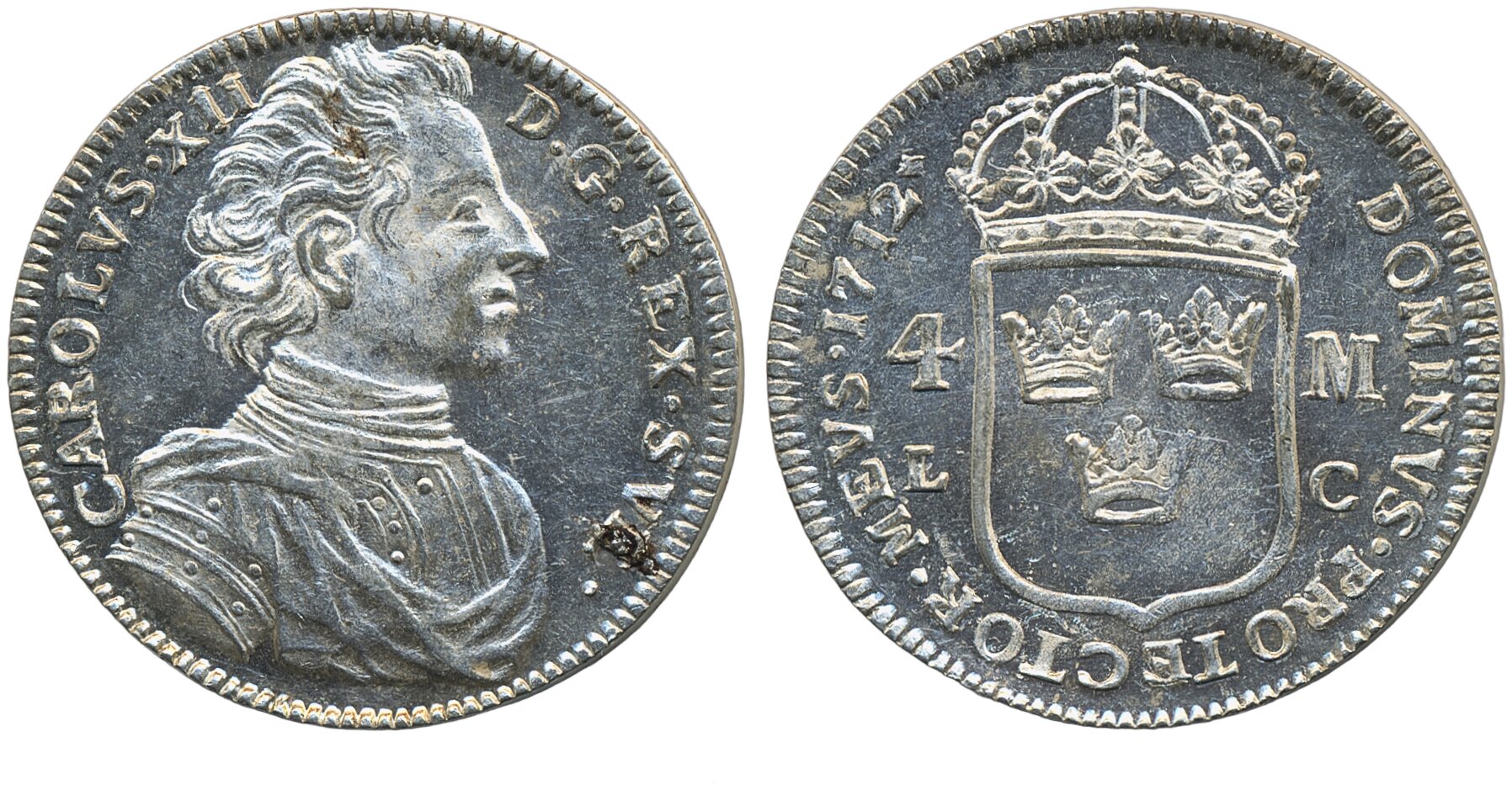 Coins, Sweden. Karl XII, SM 52, 4 mark 1712. 20.53 g. Stockholm. Lustrous well struck example, lightly cleaned. Good 01.
