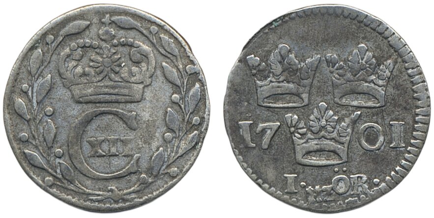 Coins, Sweden. Karl XII, SM 125, 1 öre 1701. 1.19 g. Stockholm. 1/1+.