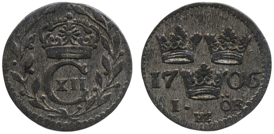 Coins, Sweden. Karl XII, SM 130, 1 öre 1706. 1.19 g. Stockholm. 1+.