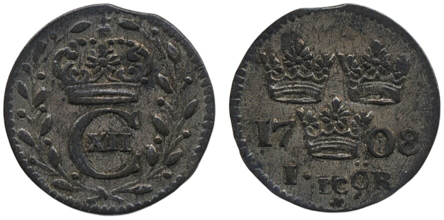 Coins, Sweden. Karl XII, SM 132, 1 öre 1708. 1.19 g. Stockholm. SMB 134. 1+.