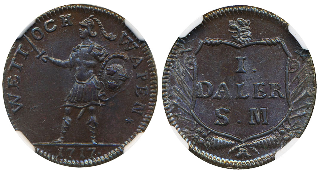 Coins, Sweden. Karl XII, SM 216, 1 daler SM 1717. Stockholm. Emergency coinage Wett och wapen. Graded by NGC as MS63BN a beautiful and lustrious example. 01/0. See certification at NGC