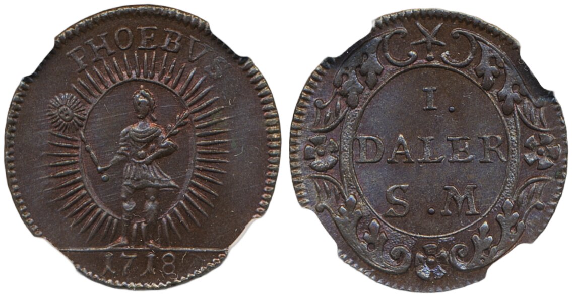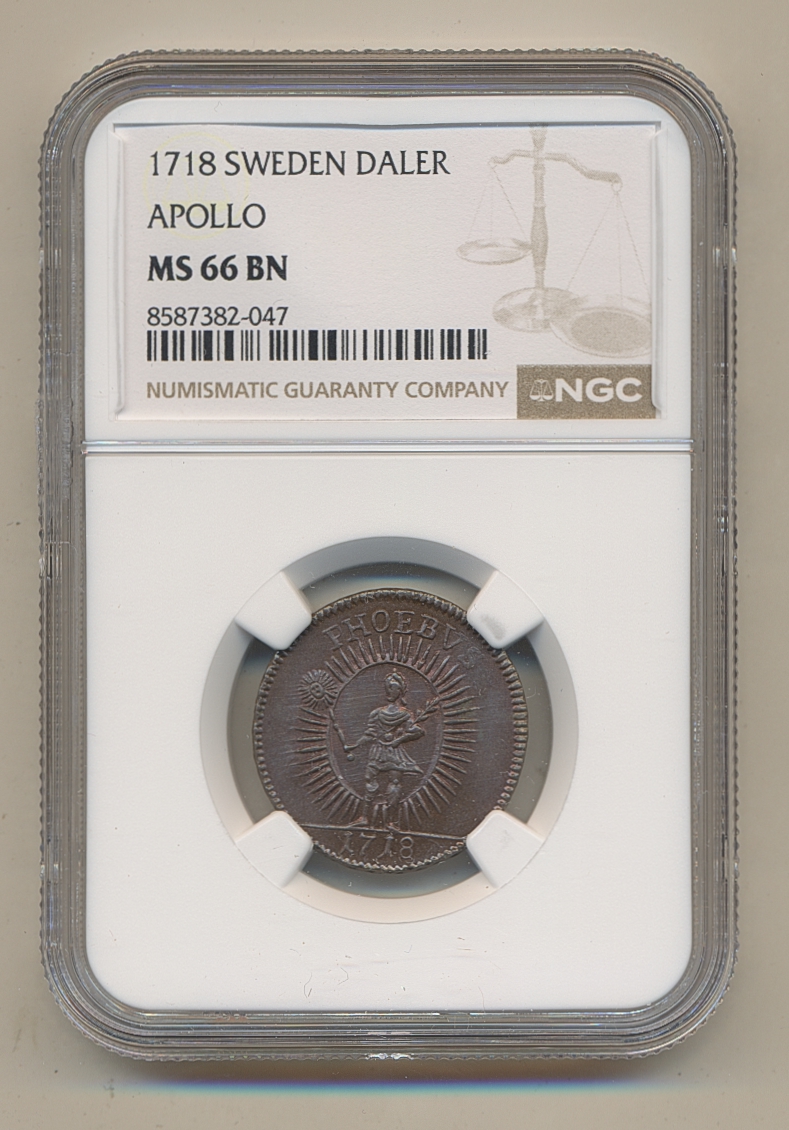 Coins, Sweden. Karl XII, SM 219, 1 daler SM 1718. Stockholm. Emergency coinage Phoebus. Graded by NGC as MS66BN a beautiful and lustrious example. Choice! 0. See certification at NGC