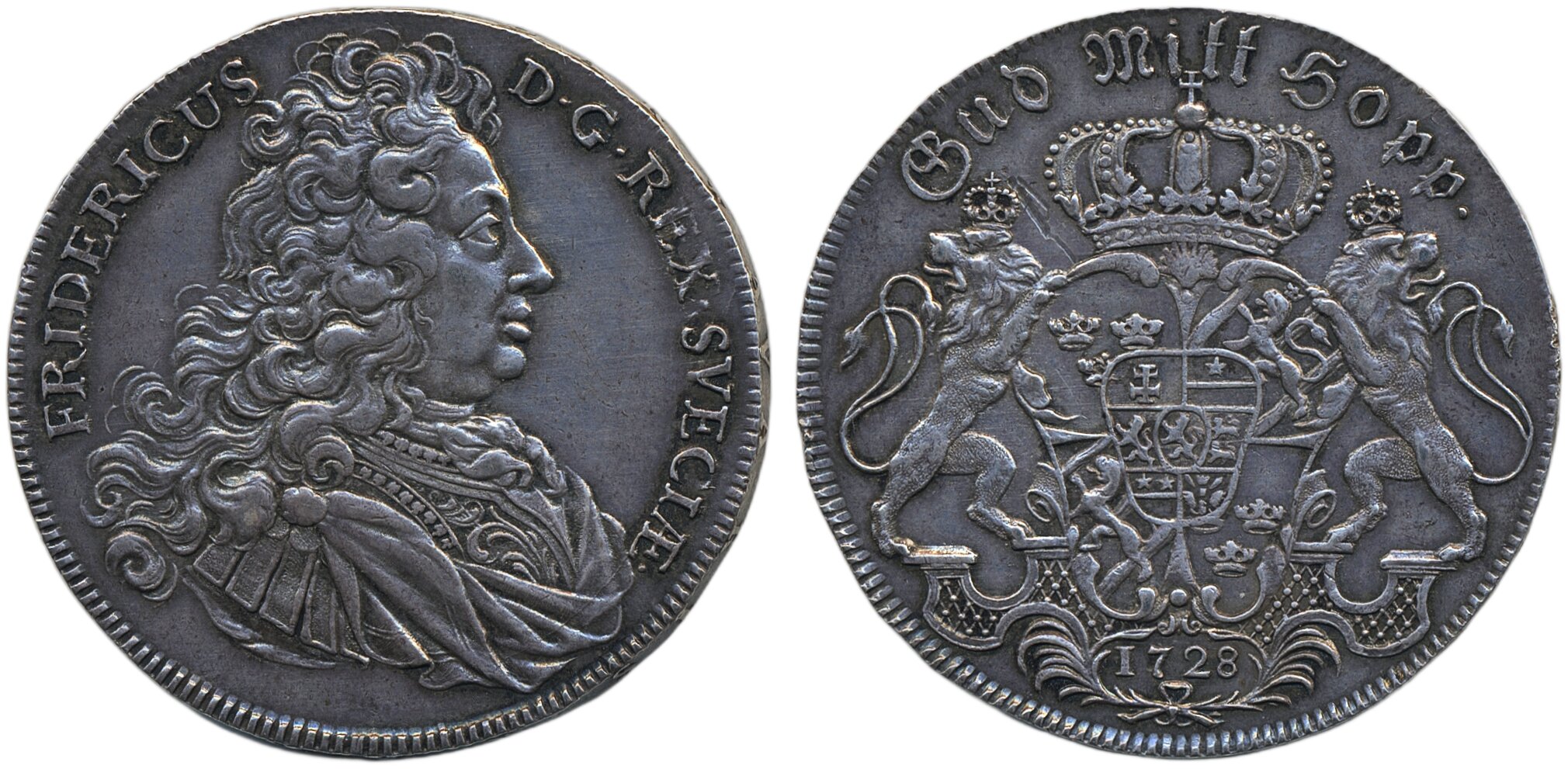 Coins, Sweden. Fredrik I, SM 68, 1 riksdaler 1728. 29.18 g. Stockholm. Beautiful lustrous example with small scratch on reverse. 1+/01.