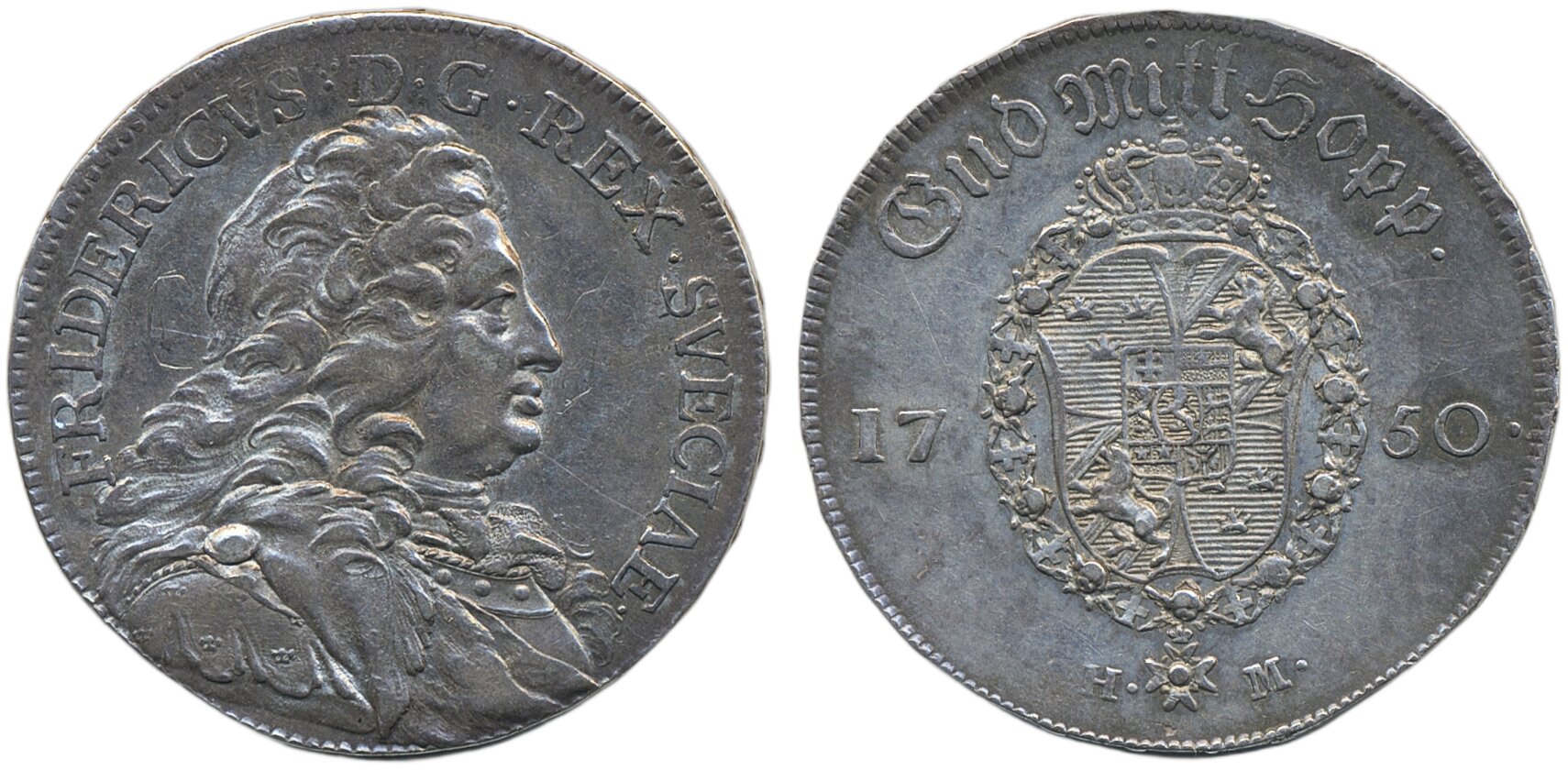 Coins, Sweden. Fredrik I, SM 101, 1/2 riksdaler 1750. 14.05 g. Stockholm. Light grafitti in obverse fields. 1+.