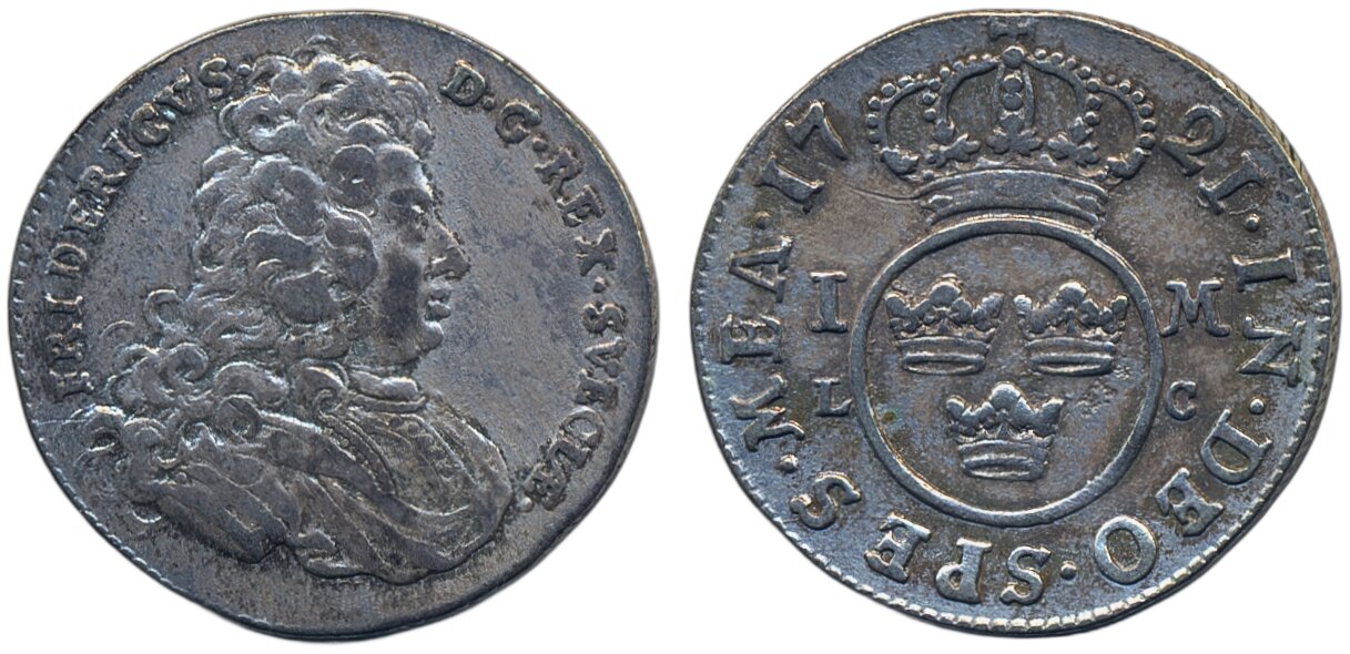 Coins, Sweden. Fredrik I, SM 122, 1 mark 1721. 5.11 g. Stockholm. Some lustre. Ex. Bruun. 1+.