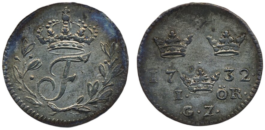 Coins, Sweden. Fredrik I, SM 135, 1 öre 1732. 1.26 g. Stockholm. 1+/01.