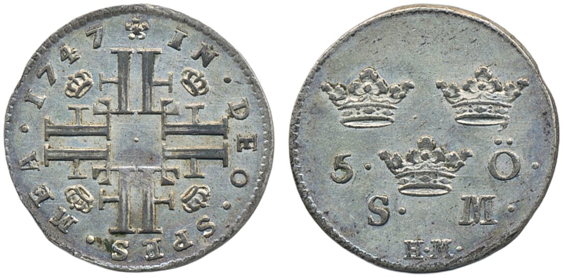 Coins, Sweden. Fredrik I, SM 151, 5 öre 1747. 3.48 g. Stockholm. 01/0.