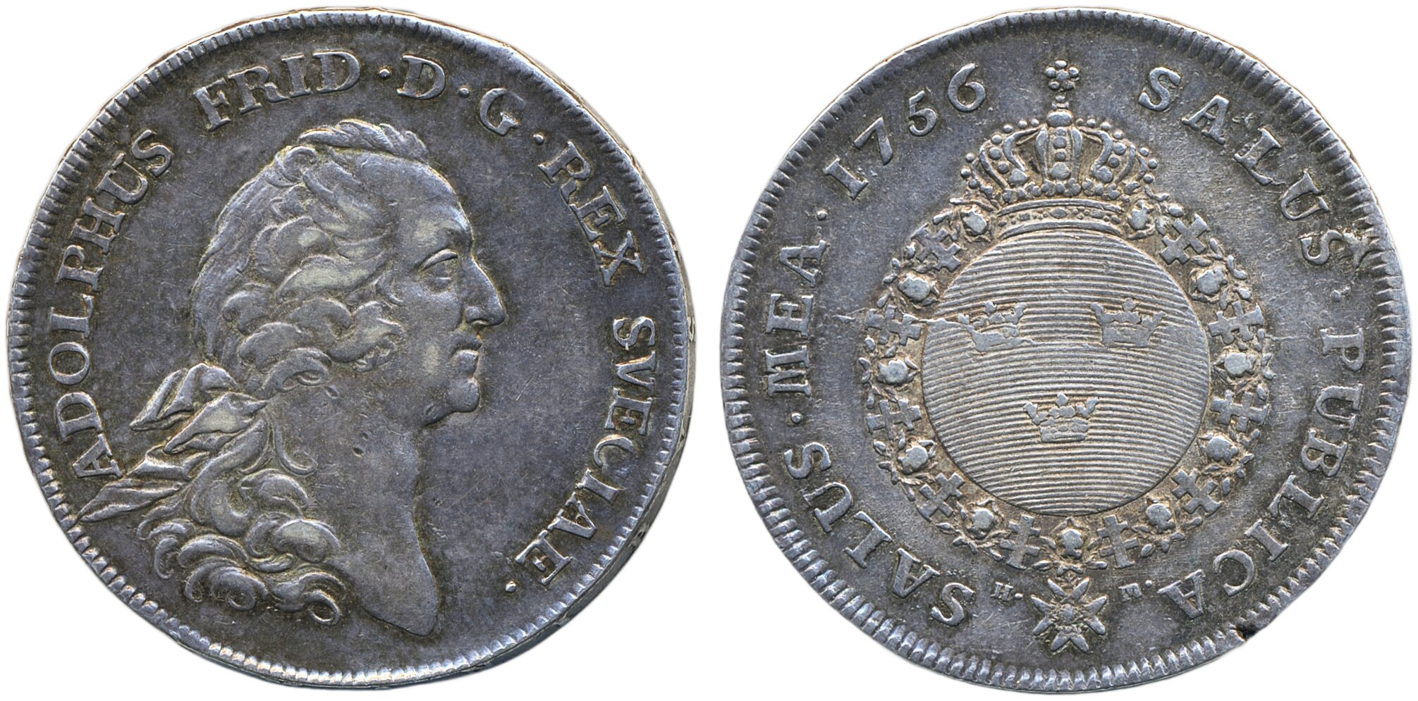 Coins, Sweden. Adolf Fredrik, SM 46, 1 riksdaler 1756. 29.23 g. Stockholm. Attractively toned. Minor planchet flaw on reverse at rim and in centre. 1+/01.