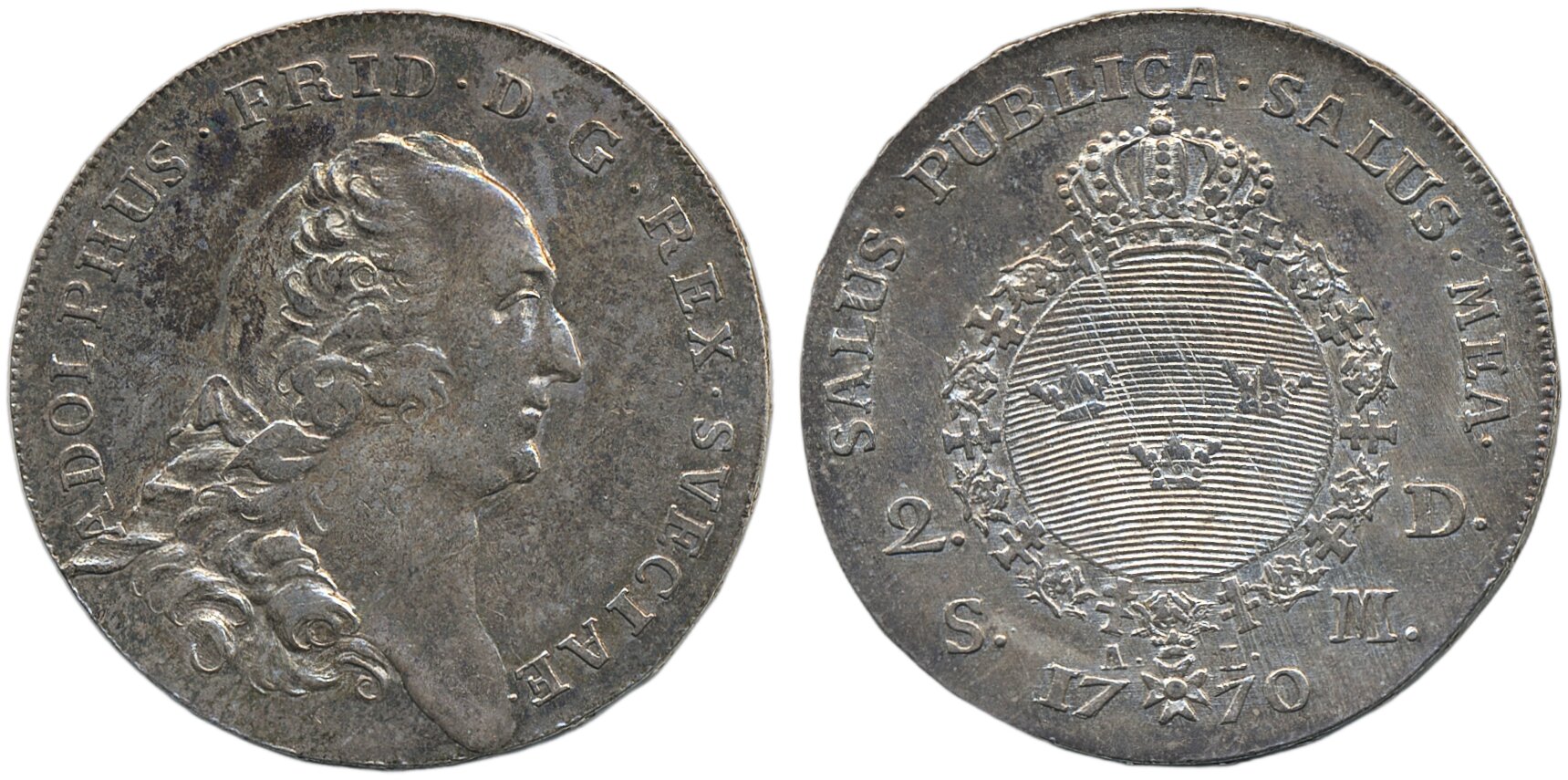 Coins, Sweden. Adolf Fredrik, SM 61b, 2 daler SM 1770. 19.54 g. Stockholm. Lightly cleaned. 1+/01.