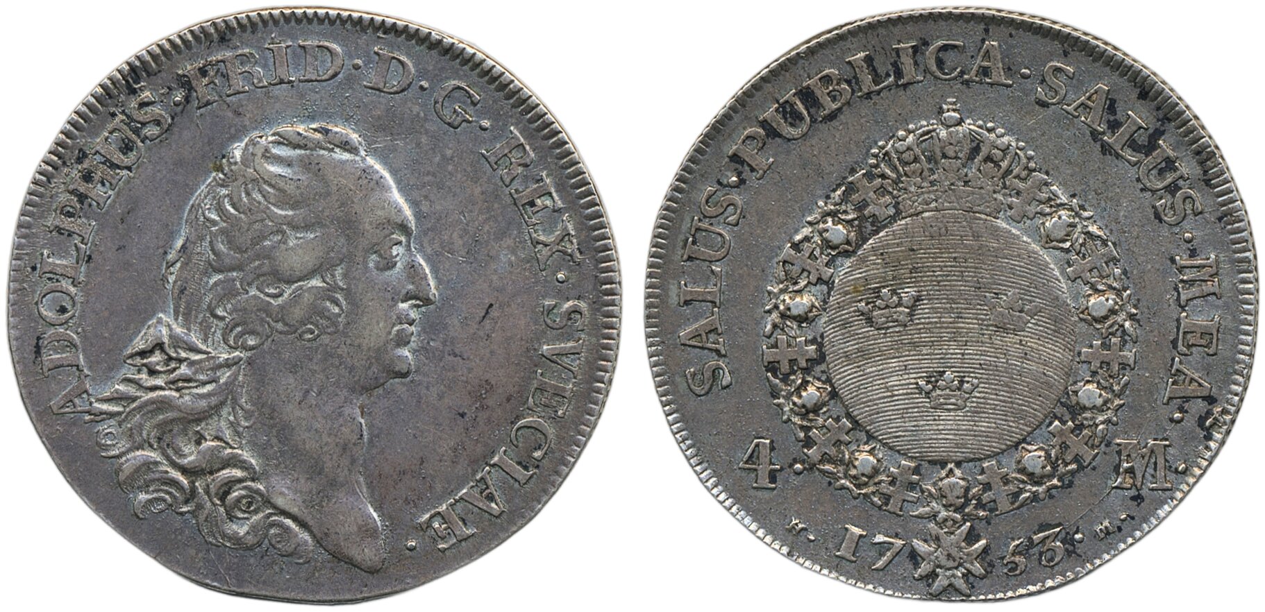 Coins, Sweden. Adolf Fredrik, SM 82b, 4 mark 1753. 21.02 g. Stockholm. 1+.