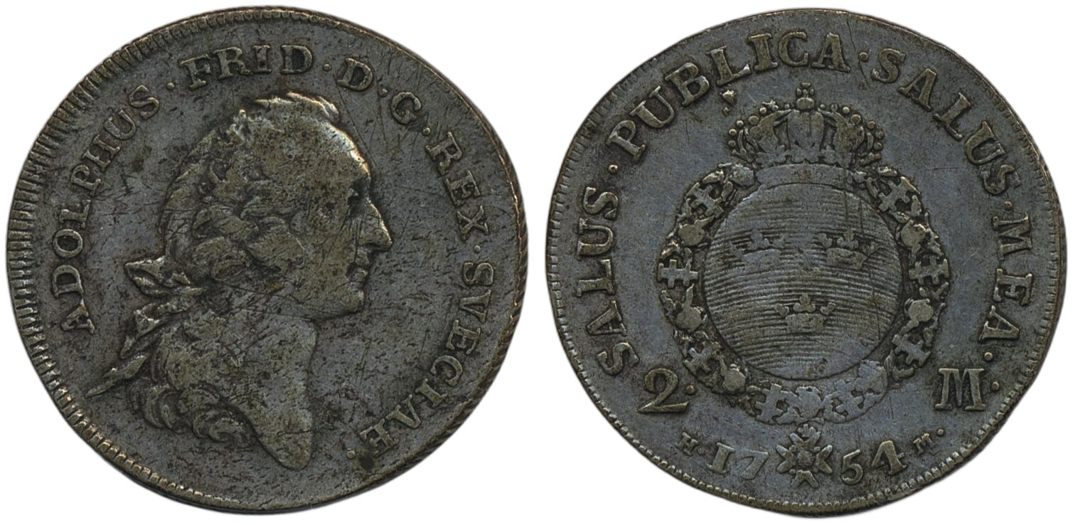 Coins, Sweden. Adolf Fredrik, SM 85b, 2 mark 1754. 10.30 g. Stockholm. Scratches. 1.