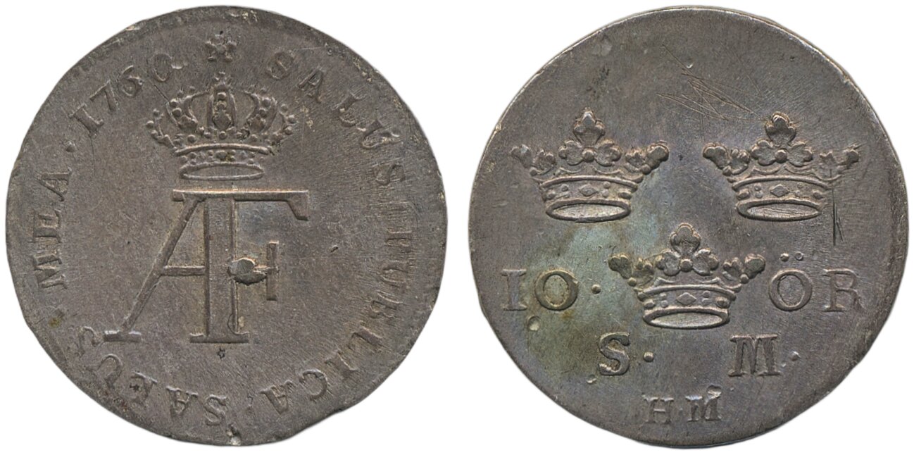 Coins, Sweden. Adolf Fredrik, SM 93, 10 öre 1760. 7.02 g. Stockholm. Pecks, scratches, edge damages. R. 1+)(Good 1+.