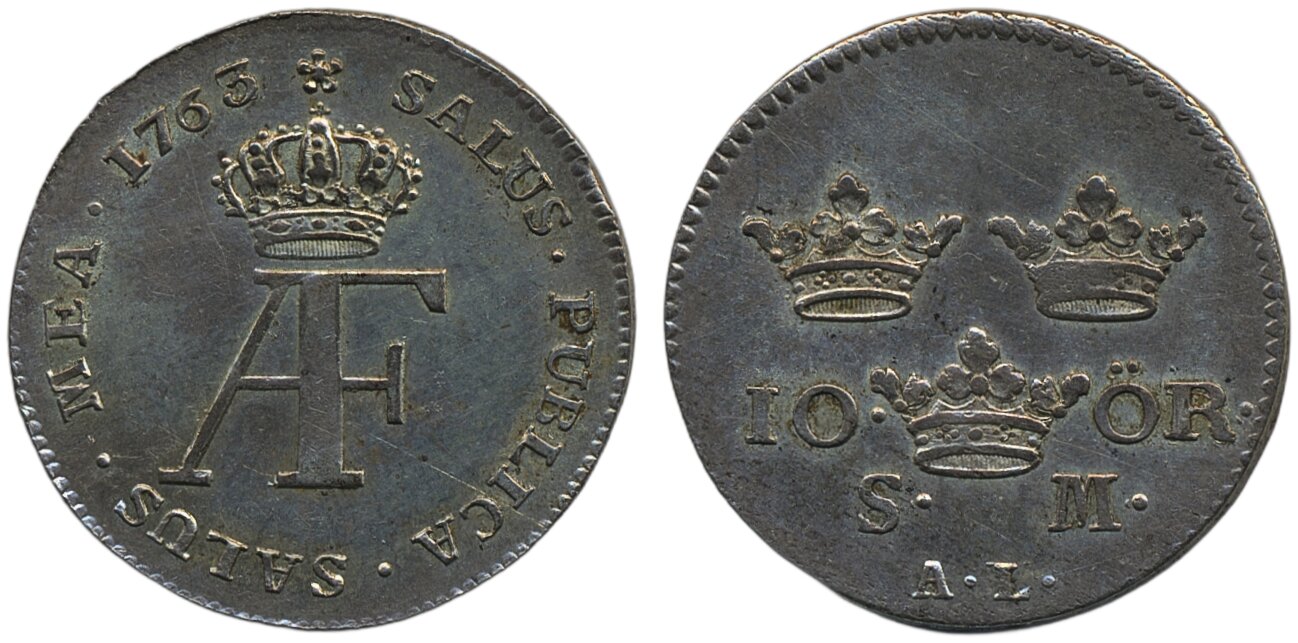 Coins, Sweden. Adolf Fredrik, SM 95, 10 öre 1763. 6.88 g. Stockholm. Ex. MISAB 17 lot 499. 1+/01.
