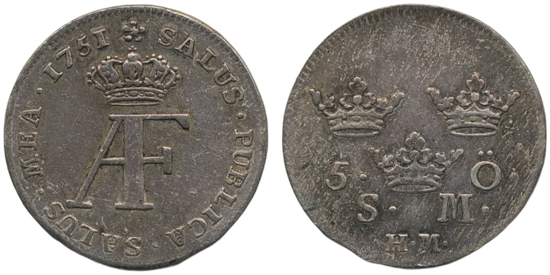 Coins, Sweden. Adolf Fredrik, SM 97, 5 öre 1751. 3.37 g. Stockholm. 1+.