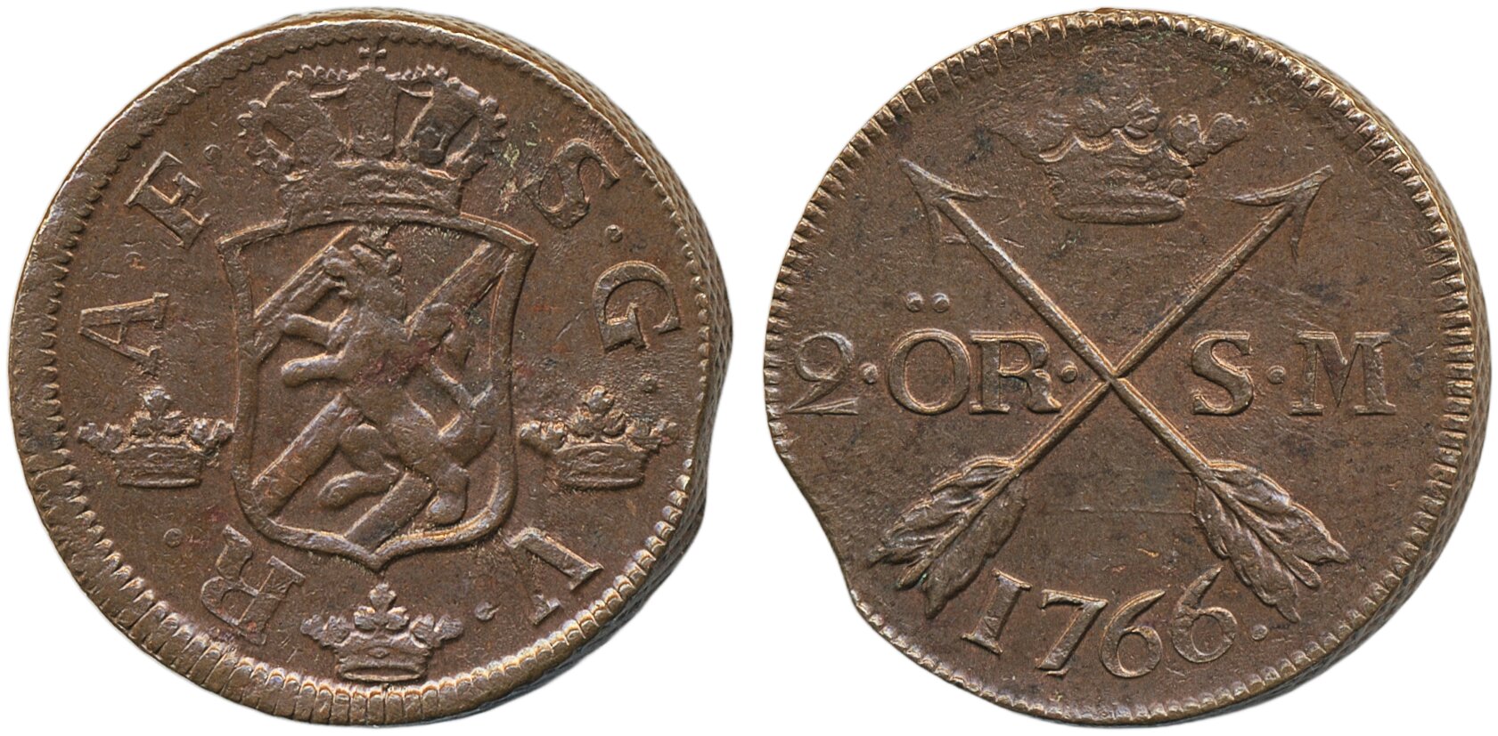 Coins, Sweden. Adolf Fredrik, SM 177, 2 öre SM 1766. 28.77 g. Avesta. Minor edge clip from production. Ex. MISAB 4 lot 1245. 01.