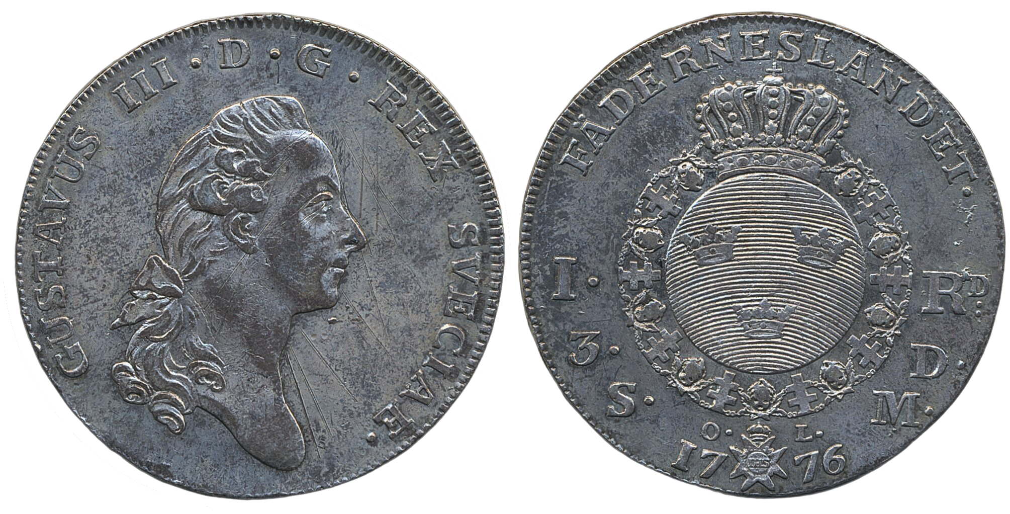 Coins, Sweden. Gustav III, SM 43, 1 riksdaler 1776. 29.26 g. Stockholm. Scratches. 1/1+.